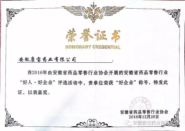 12月26日,由省藥品零售行業協會主辦的安徽省藥品零售企業“好人 好企業”頒獎典禮在省城合肥隆重舉行。康寶藥業經過逐級推薦、層層考核、公開評審等程序,最終被評為“好企業”稱號,康寶藥業員工青春嬌、李洪被評為“好人”稱號
